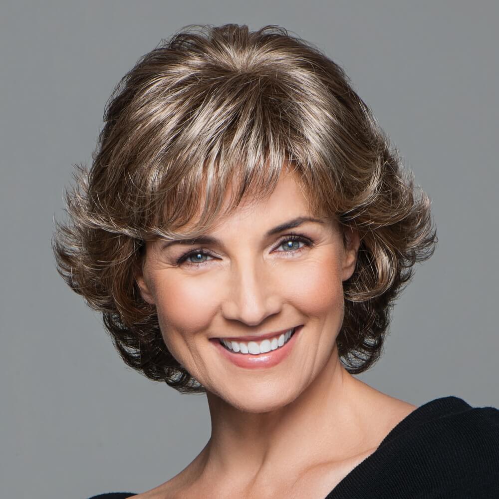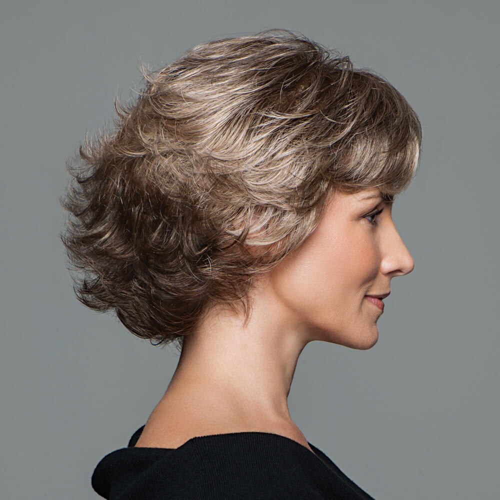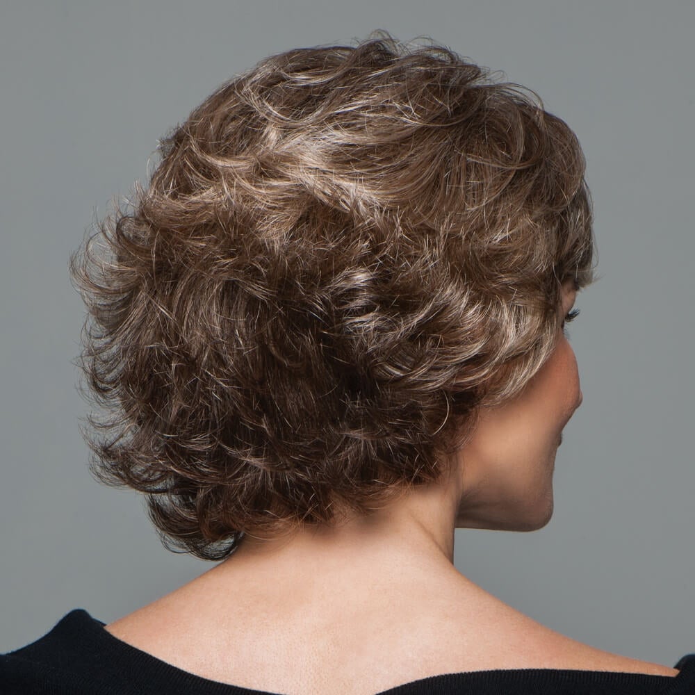 All-over curled layers are just right – not too short, not too long – with a light and luxurious hand-tied top.